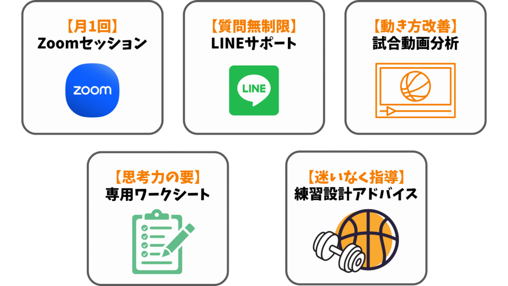 オンラインコーチングサポート(指導者向け) チームを勝利に導く力を。 COACH SUPPORT ABOUT 「思考力」と「言語化力」で、“確信ある指導”を。 保護者コーチ、指導者向け個別オンラインサポート。 小・中・高の指導者や保護者コーチを対象に、 戦術・試合分析・育成設計の個別サポートを行います。 「勝ちたいけど何から手をつけたらいいか分からない」 そんな指導現場のリアルな悩みに対し、“今のチームに合った指導の軸”を一緒に構築していきます。 個別相談や試合動画の分析を通じて、 「チーム戦術/戦略の設計」「練習メニューの組み方」「子ども世代の育成術」まで、 日々の指導に即したかたちでサポートを行います。 根拠と自信を兼ね備えた指導で、周囲の信頼を勝ち取りましょう。 こんな人におすすめ 指導にいまいち自信が持てない… とにかくチームを勝利に導きたい 効果的な戦術を使えるようになりたい チームから信頼されるコーチになりたい サービス紹介 ❶リアルタイムZoomセッション 定期的なリアルタイムのZoomで 選手の状況に合わせて最適なサポートを提供します。 ❷LINEチャットサポート バスケに関する疑問をいつでも質問可能。 迷いなく指導ができるようサポートします。 ❸試合動画分析 提出動画を細かく分析し、 チーム状況に合わせてアドバイスします。 ❹専用ワークシート 日々の取り組みを無駄にせず、 実力として定着させるための専用シートです。 ❺練習設計アドバイス チームの状況に合わせて、 練習メニューの設計をアドバイスします。 プラン/Plan Basic(月額制) 期間:1ヶ月〜 ZOOM:月1回(1回50分) LINE質問:無制限 試合動画分析:月2回まで 期間:3ヶ月 ZOOM:期間内に最大6回(1回50分) LINE質問:無制限 試合動画分析:週1回まで Premium(パックプラン) Q.保護者コーチや学生コーチでも大丈夫ですか? はい、問題ありません。経験年数やレベルに関わらず、今の状況に合わせてサポートします。 Q.バスケ経験がなくても大丈夫ですか? もちろん可能です。 未経験者からコーチを任される方も増えています。 Q.解約はいつでもできますか? 決済日の2日前までであれば翌月分から解約が可能です。 よくある質問(FAQ) まずは体験してみる